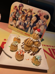 ここで、事件が起きる。コラボドリンクやコラボフードを注文すると、一つの商品につき一つノベルティが貰えるのですが、当日のスタッフさんたちが忙しかったためか、退室10分前に3本のドリンク(ほぼパフェ)と1つのアイスシュークリームタワーが到着!
